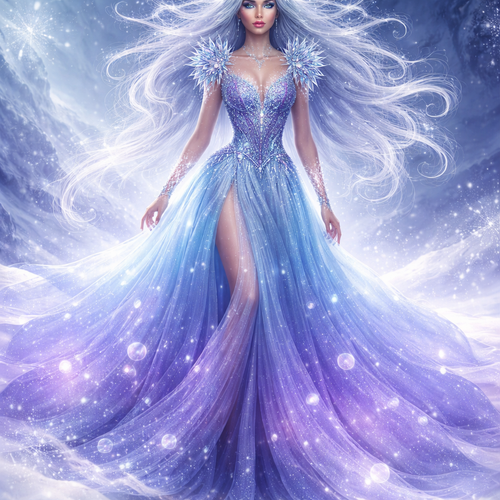 With the theme of cold air her hair looks like it frozen and her dress had cycles on it right billow is a purple and bl...