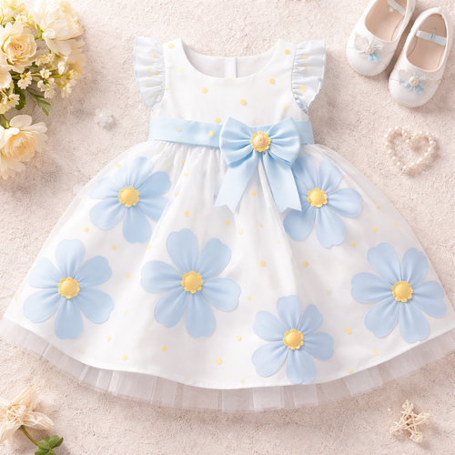 A baby’s girls dress with flowers on the flower petals are pastel blue and the middle of the flower is pastel yellow. Al...
