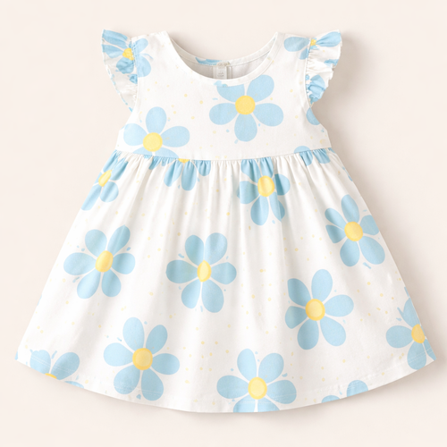 A baby girls dress with a solid white base with flowers on the slower petals pastel blue and the middle bit of the flowe...