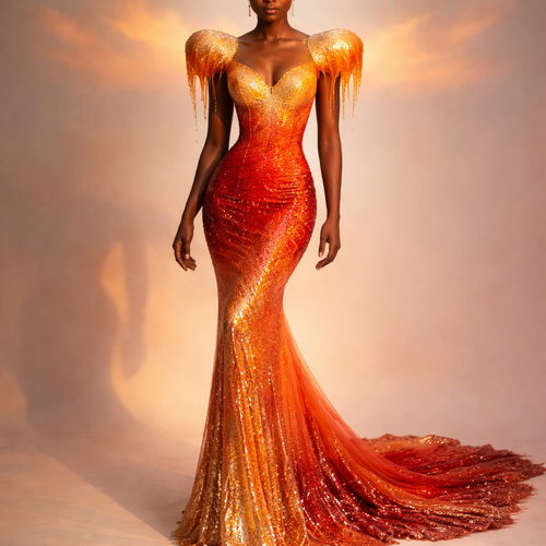 The them of the dress is warm air it had shoulder pads that look like its melting and it has a sunset ombre and below h...