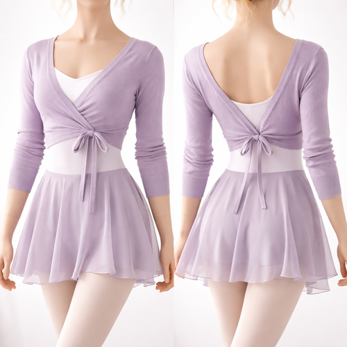 Es ist fürs Balletttraining ein Body mit Rock und so ein kurzer Arm Pullover zum drüber ziehen . Lila in der Pulli schwa...