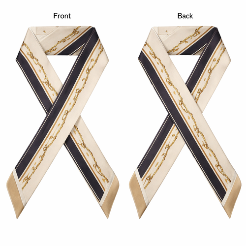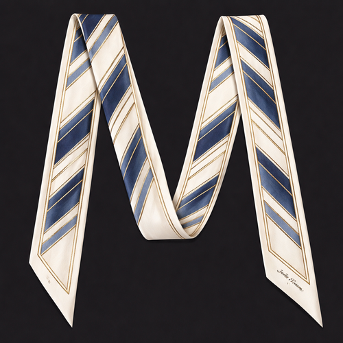 Design a 5cm x 86cm silk twill scarf for Jolie Franc, combining British tailoring precision with subtle feminine proport...