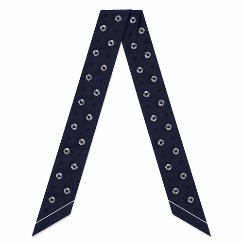 Silk twilly scarf 5x86cm, Kelly bag wrap style, J. Press preppy style, deep navy base, subtle repeating tiny gray and wh...