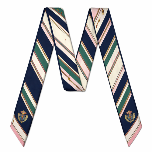 Design a silk twilly scarf, 5cm x 86cm, Kelly bag style wrap, inspired by J. Press preppy style. Base color deep navy b...