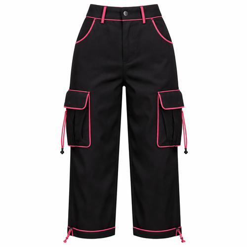 black lightweight feminine cargo pants with hot pink trim