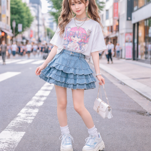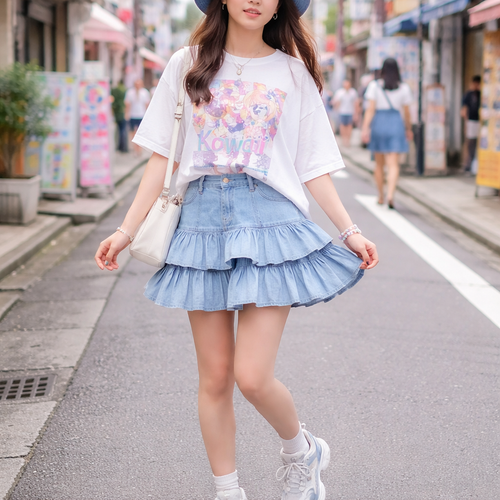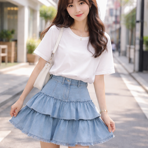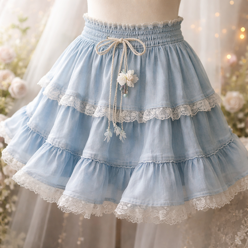 layered ruffle very light blue denim skirt. shorter than knee length