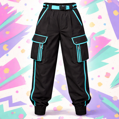 black lightweight pretty cargo pants with aqua trim