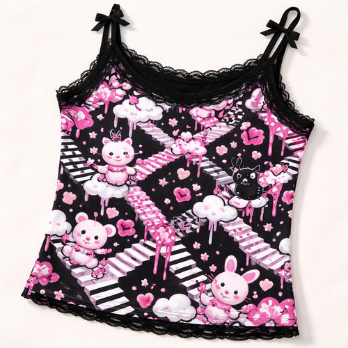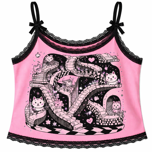 kawaii meets mc escher tank top in bright pink black and white with black lace trim