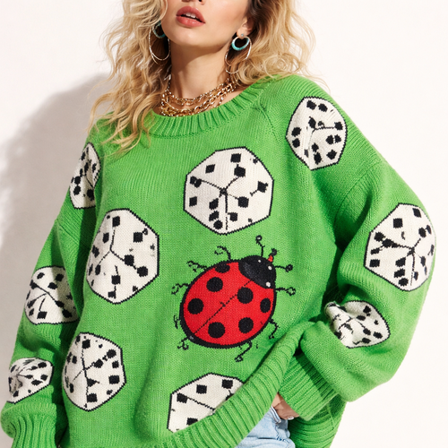 a bright green chunky sweater with black and white dice all over, have on of the dice have a cute red lady bug on it.