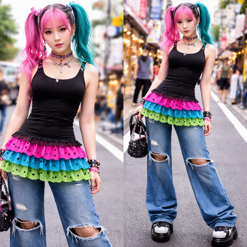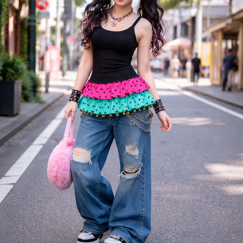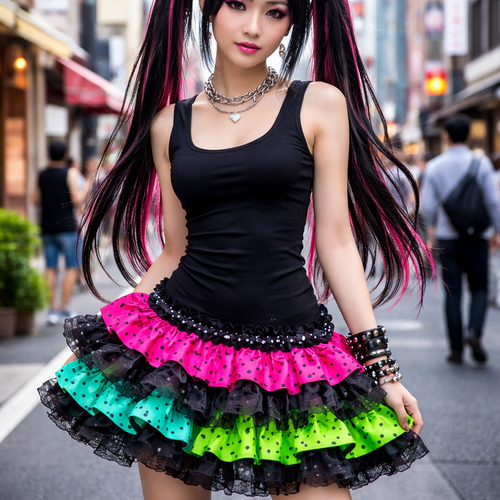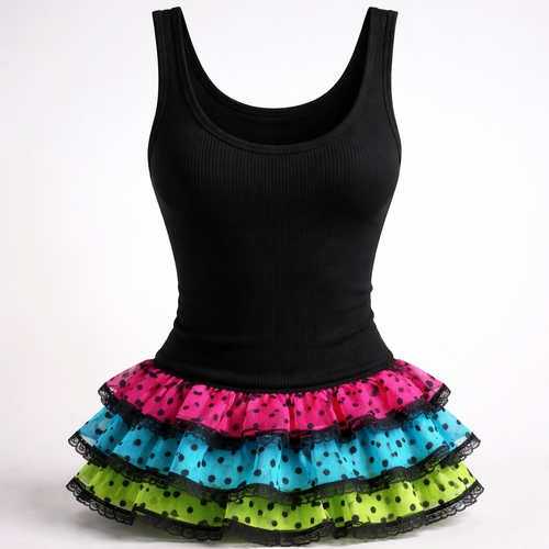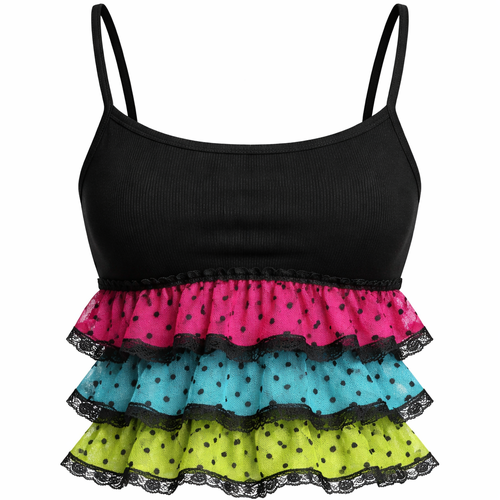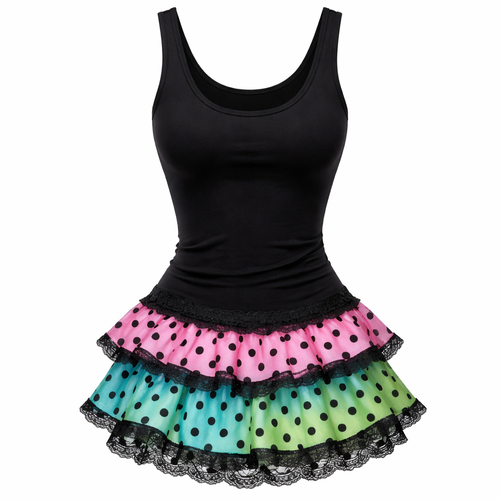 pretty black form fitting tank top with lace ruffle layers at the bottom. a hot pink with black polka dots layer, an aqu...