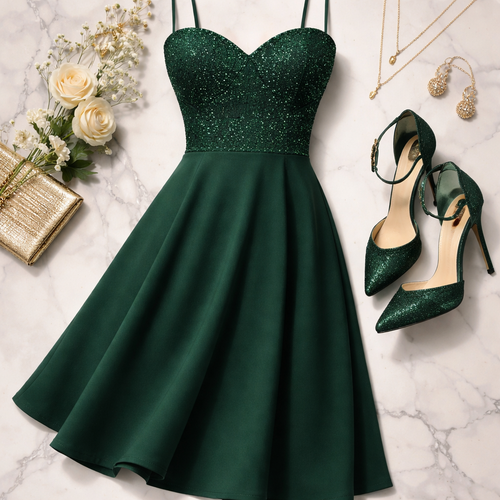 Create a dress made of cotton/elastane that is Dark green with glitter on the bodice, is knee length, has shoestring str...