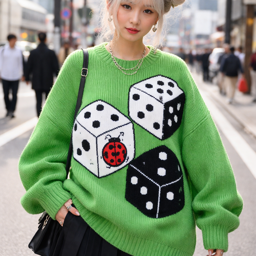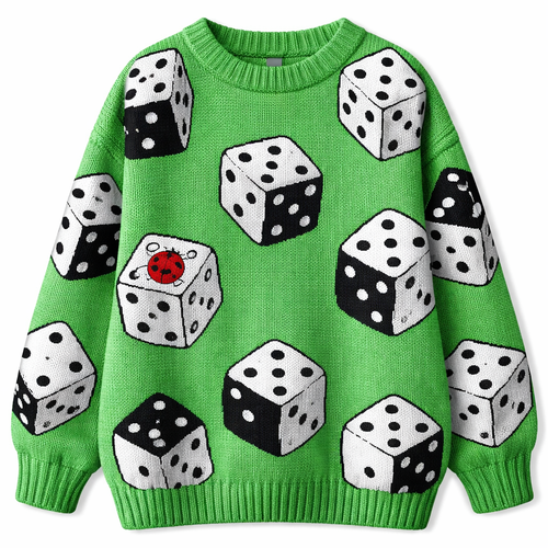 a bright green chunky sweater with a pair of big black and white dice, draw a cute red ladybug as one of the faces of on...