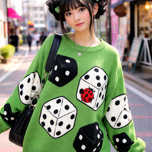a bright green chunky sweater with big black and white dice all over, draw a cute red ladybug as one of the faces of one...