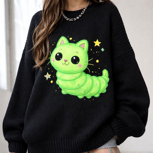 a black chunky sweater with a big, cute, neon cat caterpillar hybrid