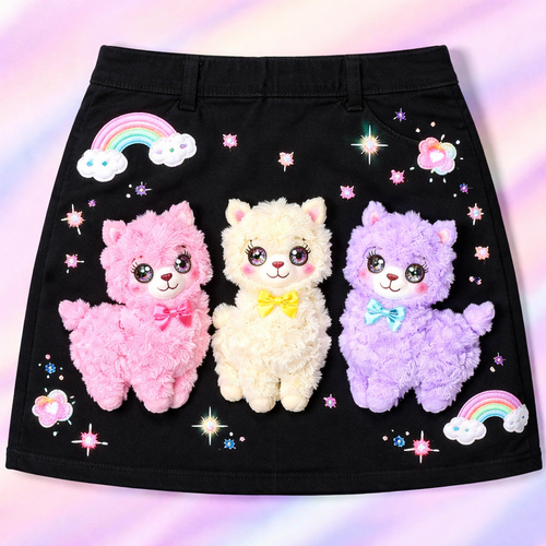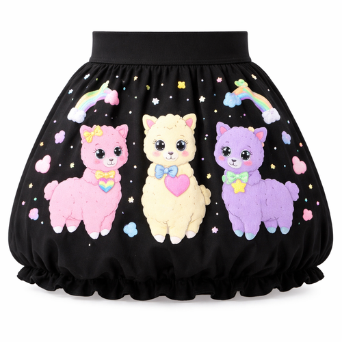 just above the knee length black cotton skirt with cute pastel cartoon fluffy 3d textured alpacas