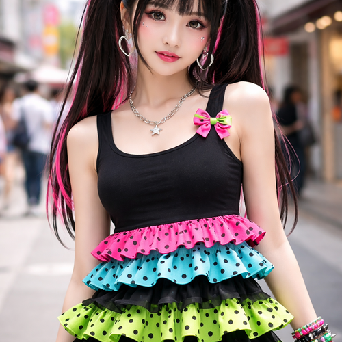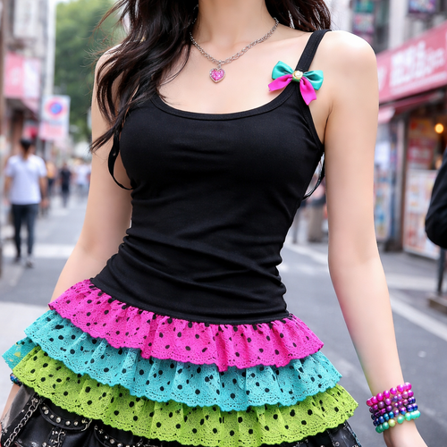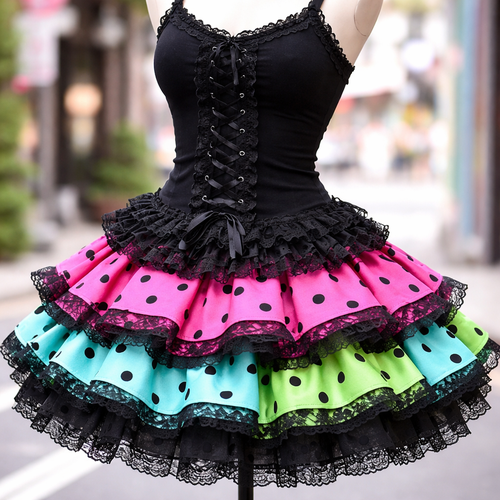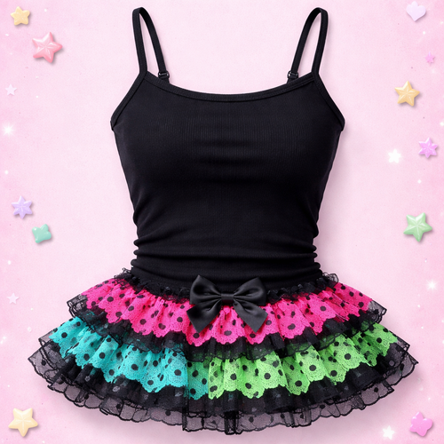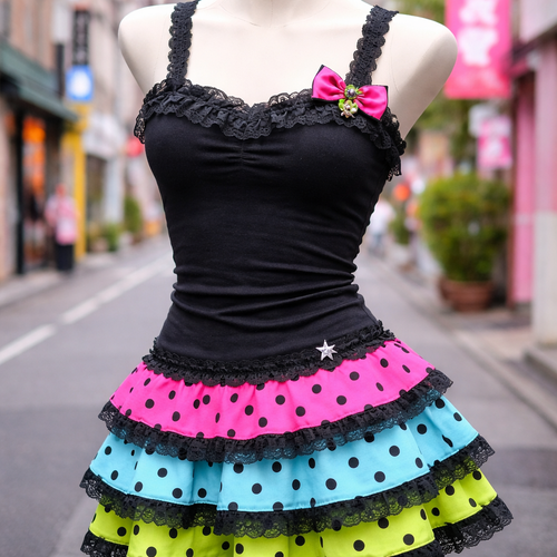 pretty black form fitting tank top with lace ruffle layers at the bottom. a hot pink with black polka dots layer, an aqu...