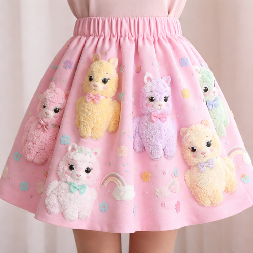 just above the knee length cotton skirt with cute pastel cartoon fluffy 3d textured alpacas