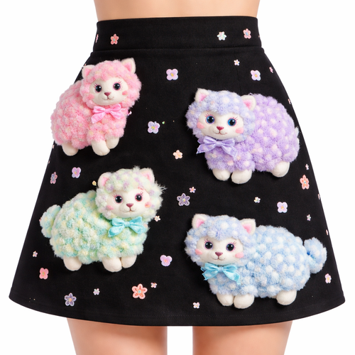 just above the knee length pretty black cotton skirt with cute pastel cartoon fluffy 3d textured sheep cat hybrids