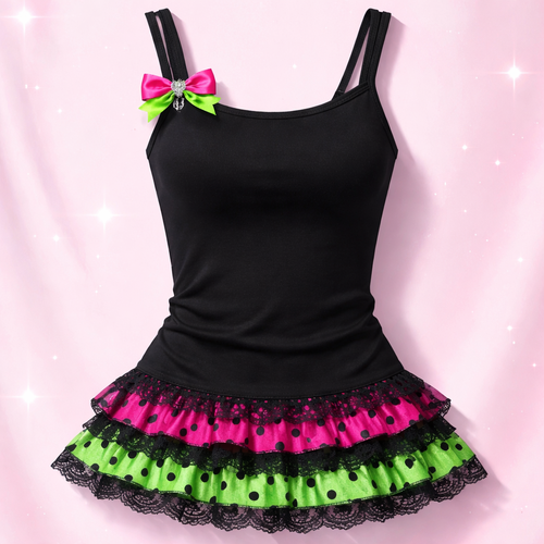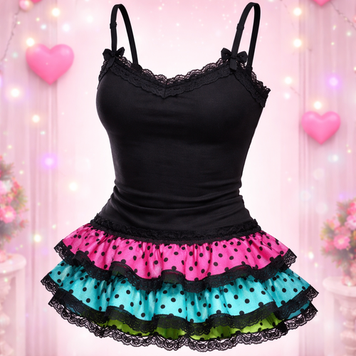 pretty black form fitting cotton tank top with white polka dots with a ruffle layered skirt. a hot pink layer and a brig...