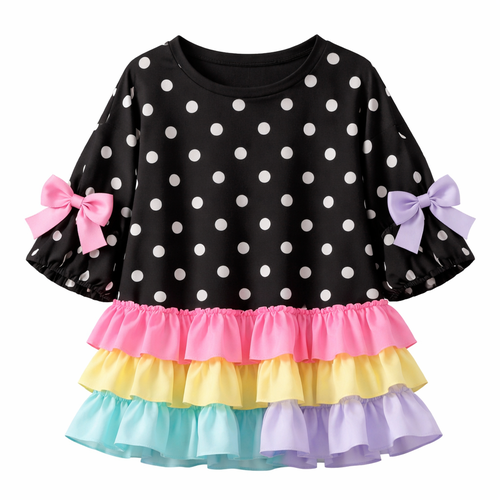 pretty black form fitting cotton shirt with white polka dots and layers at the bottom. a hot pink layer, a yellow layer,...