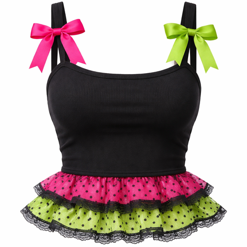 pretty black form fitting cotton tank top with white polka dots and ruffle layers at the bottom. a hot pink layer, a yel...