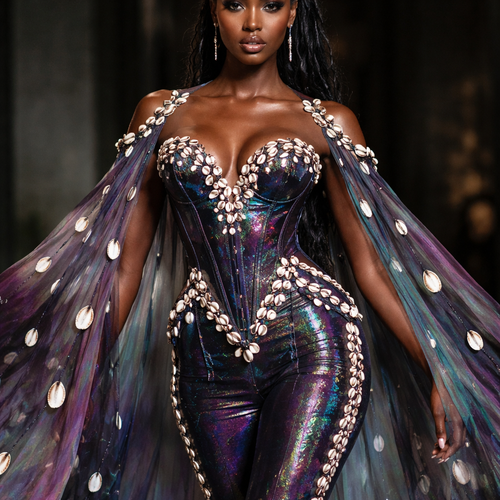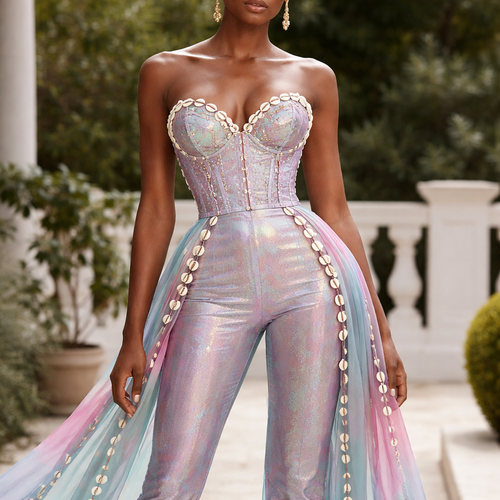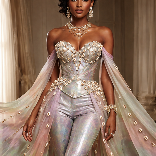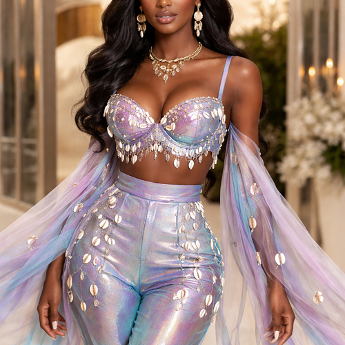 Create one of a kind top and pant that has cowries, and made from taffeta fabric with iridescent touches and design with...