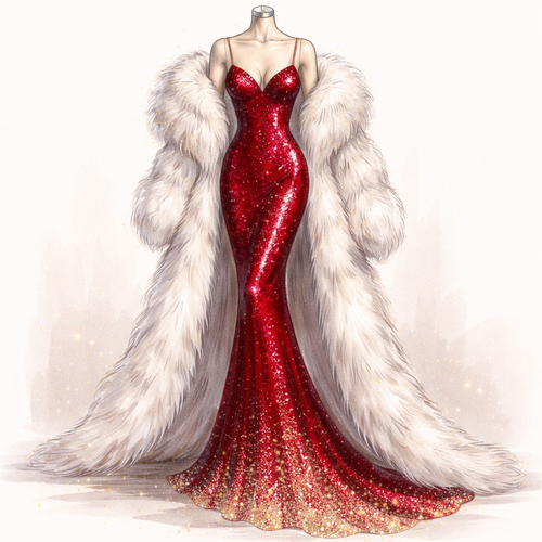 Create a sketch of a mannequin wearing a red long sequenced dress with a hint of soft gold glitter and fur coat wrapped ...