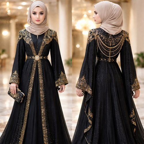A neat formal aesthetic abaya teen and pretty with hijab in black and gold theme