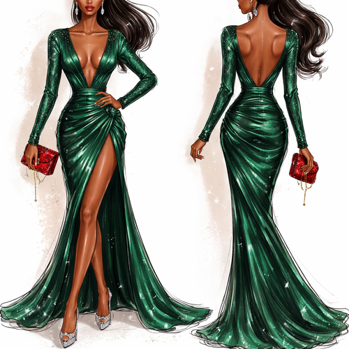 Create a Christmas gown. Deep V neckline long sleeve Dress in Silk fabric. Model is dark skinned with red lipstick on, h...