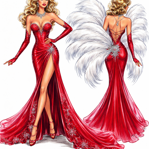 Illustrate the front and back of a Christmas gown!!! Red silk gown. Deep V and fitted. With white Diamond starting as th...