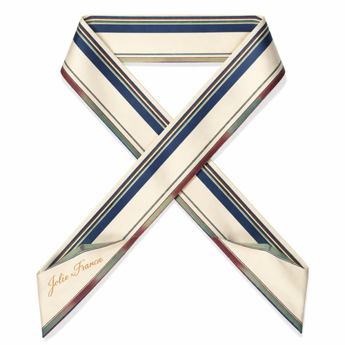 Design a 5cm x 86cm silk twill scarf for Jolie Franc with a classic American preppy base and British tailoring, softened...