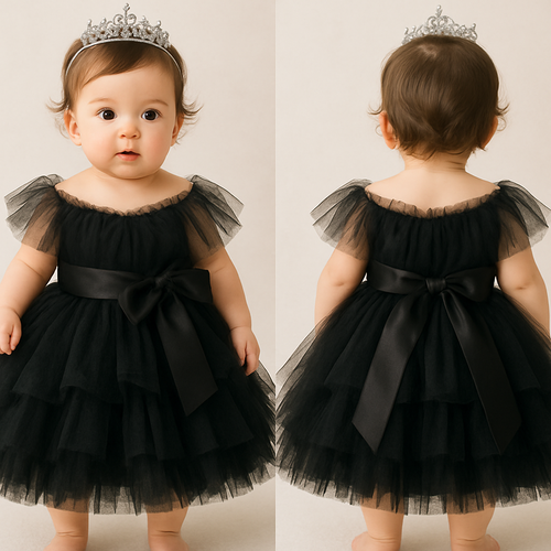 1歳の女の子のベビードレス着用画 黒のチュールドレス、膝丈のラッフルスカート(ボリューミー) 上半身は、細かいギャザーを寄せたベアトップのチュールのボディス その上から同一色のチュールを、腕を覆いすぎず、胸元の中心に軽くねじって寄せたような...