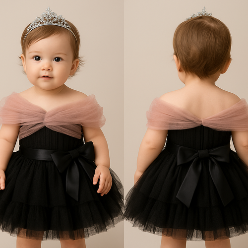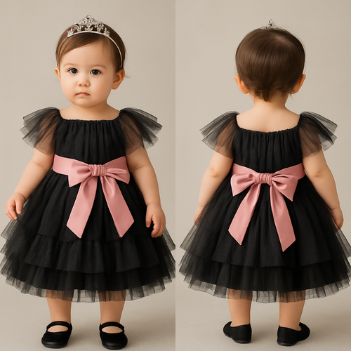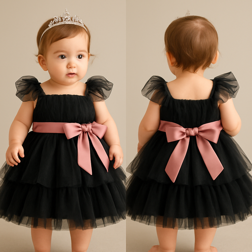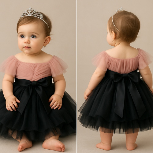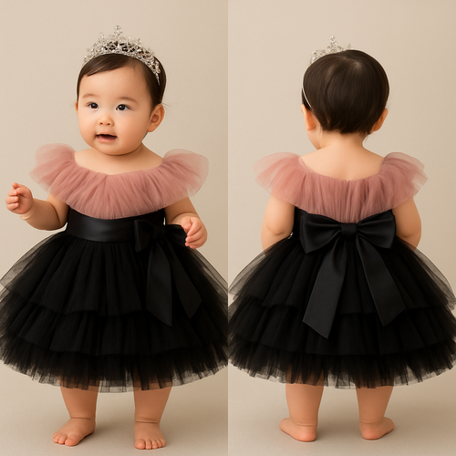 1歳の女の子のベビードレス着用画 黒のチュールドレス、膝丈のラッフルスカート(ボリューミー) 上半身は、ローズピンク、細かいギャザーを寄せたチュールのボディスに、胸元から肩にかけてふんわりとかかるオフショルダー風のチュールを重ねたデザイン、...