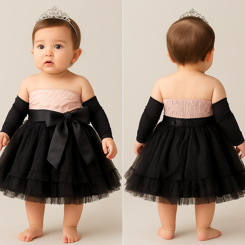 1歳の女の子のベビードレス着用画 黒のチュールドレス、膝丈のラッフルスカート(ボリューミー) 上半身は薄ピンクでベアトップ、下のチュールに合う、大人っぽい素材、シワシワな感じ切り返し 上の薄ピンクの部分に黒のサテン生地の太めのリボンを一周巻...