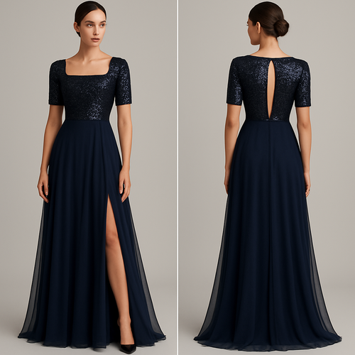 Se trata de un vestido largo de gala en color azul marino , de estilo elegante y moderno, con una combinación de tejidos...